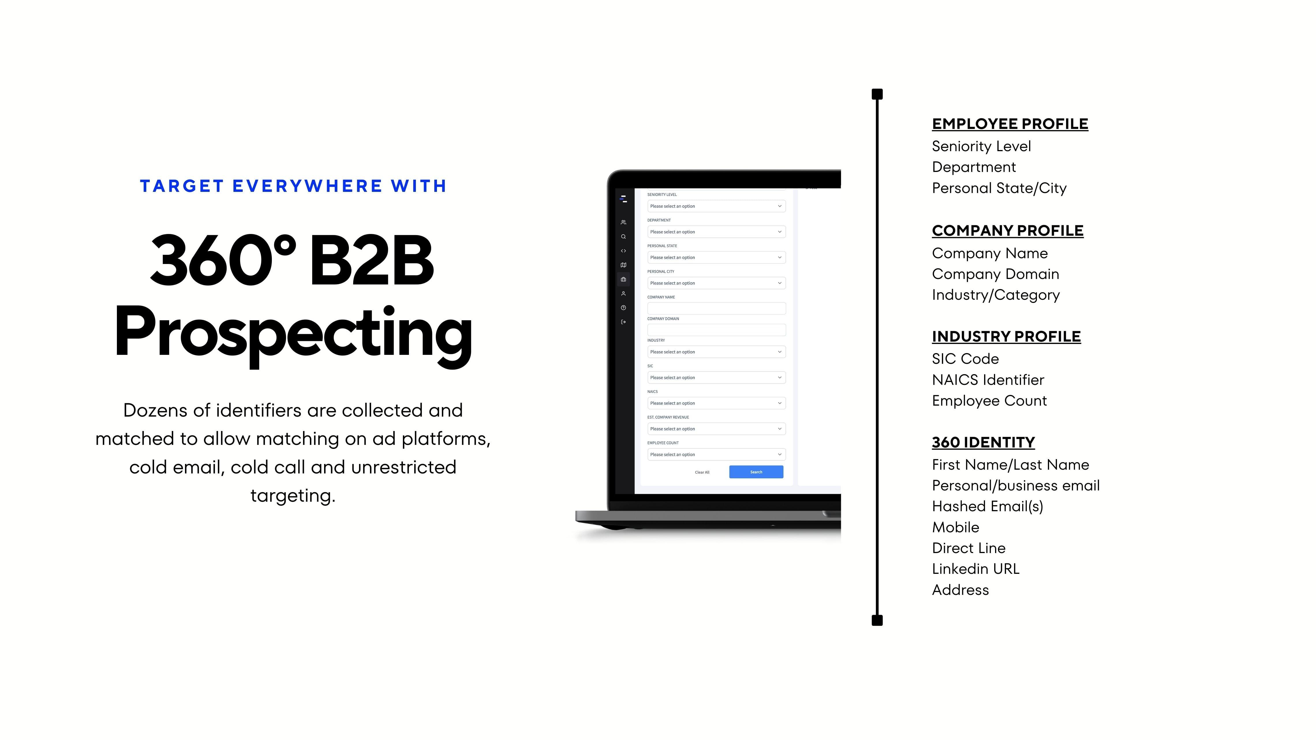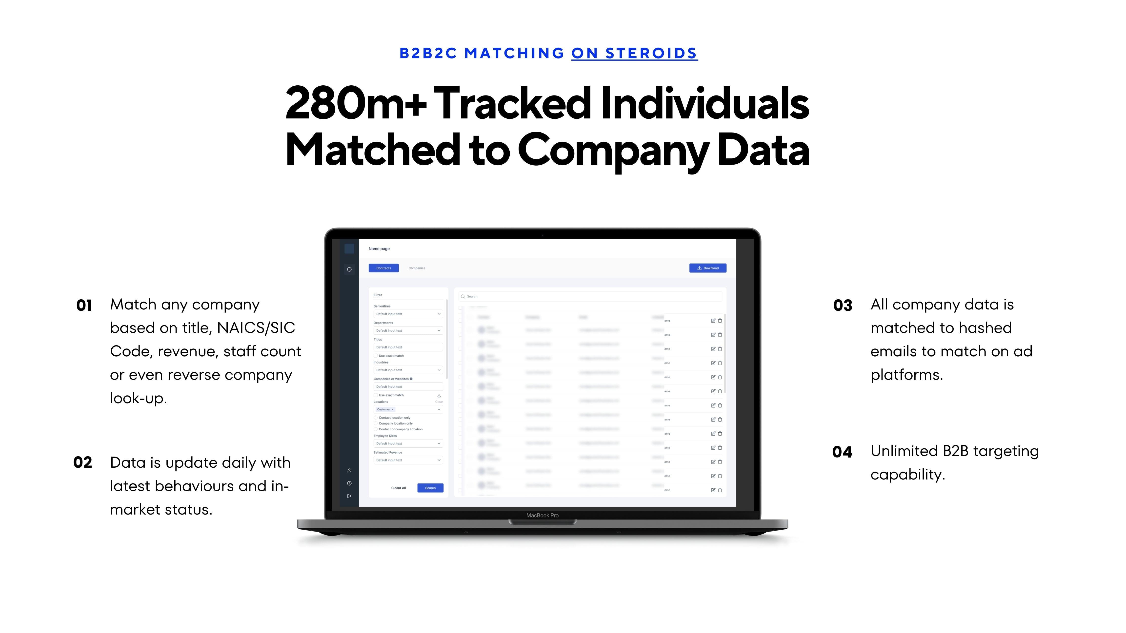 Target Any Company Data On a Personal Level: Our B2B2C matching system allows you to target the exact individuals matched to a company on any platform.
